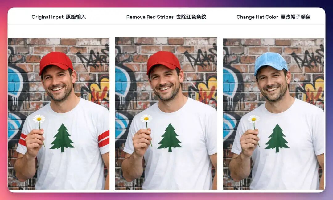 Prompt 示例(移除)“移除男人白色T恤上的树形Logo。不要改变其他任何东西。”
