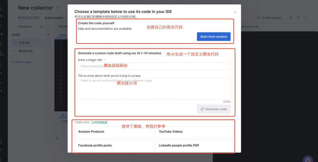 之后出现弹框,我们可以直接创建自己的爬虫代码,也可以用AI帮我们生成自定义爬虫代码(需要填写目标网站、爬虫提示词),AI Scraper Studio提供了模版供我们选择,比如:Amazon Products、Youtube Videos、Faceboos profile posts、LinkedIn people profile PDP等等