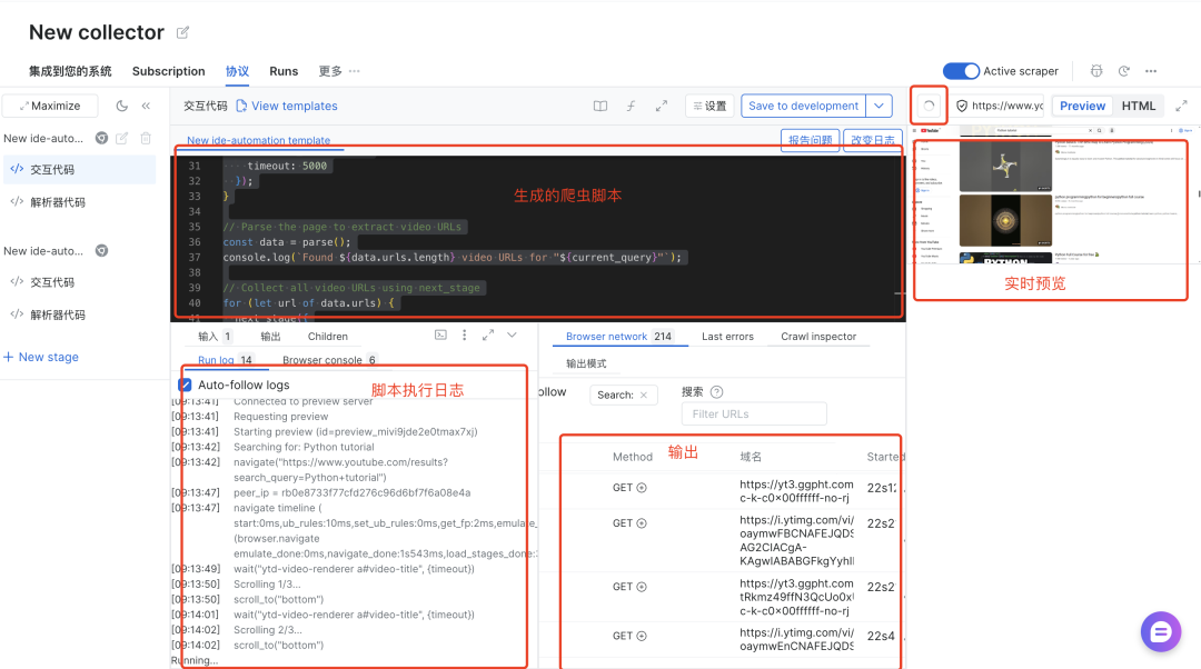 随后我们可以在页面看到生成的代码,点击右侧的执行按钮(运行爬冲代码,可以在下面的“输入”选项卡中指定要使用的输入),可以看到脚本实时执行,以及实时输出,实时爬取