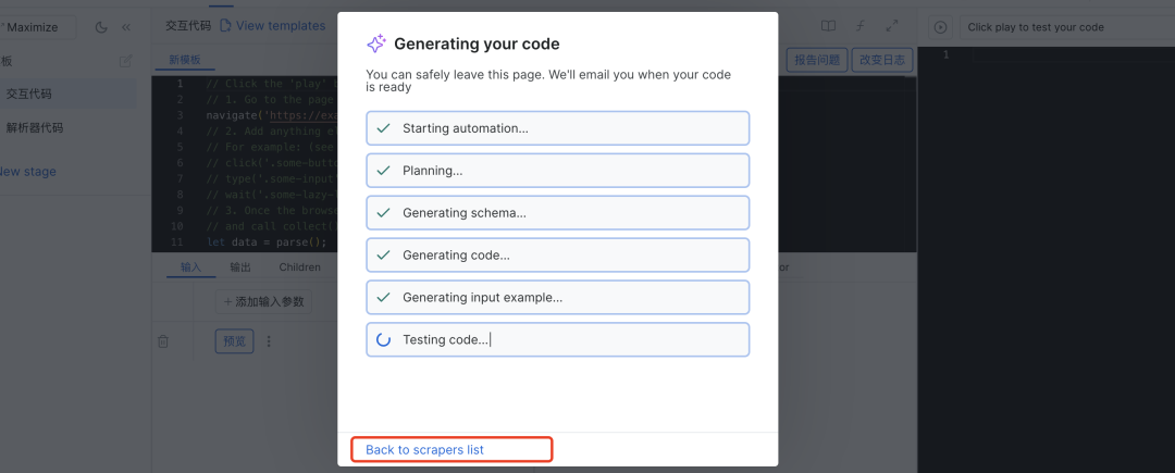 可以点击上面的“Back to scrapers list”,在我的爬虫列表看到新建的爬虫状态