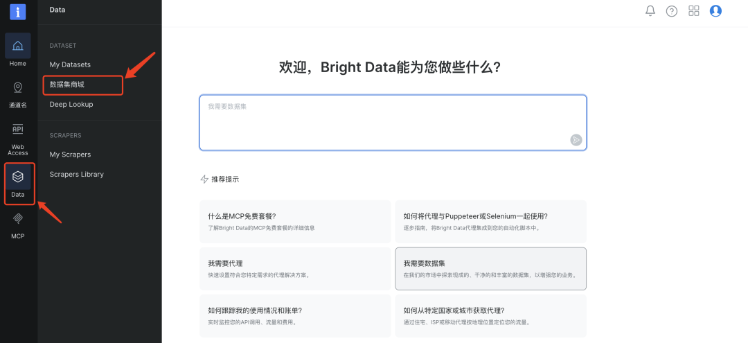 首先需要登录到Bright Data 用户控制面板,选择左侧菜单中“Data”的二级目录“数据集商城”。地址: