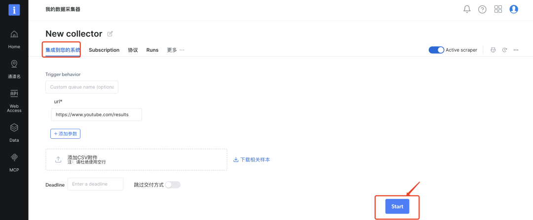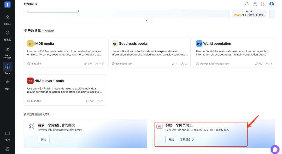 在下面选择“构建一个网页爬虫”,它能够将 AI 提示转换为爬虫,具有完整的 IDE 控制、调度和指标,点击“开始”