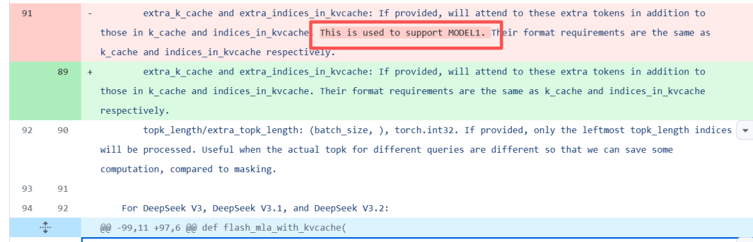 函数签名里把原来写死的 “MODEL1 专用” 字样删掉,但 extra_k_cache / extra_indices_in_kvcache 参数仍然保留。