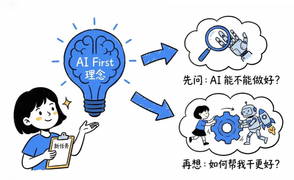 我们应该尽量秉承“AI First” 的理念,很多任务首先想到的是 “AI 能不能做好”,“如何让 AI 帮我干得更好”。