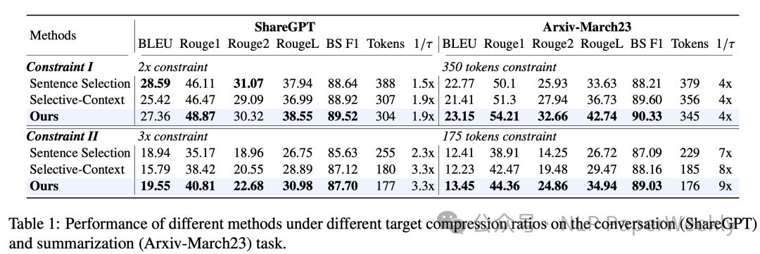 2 在对话(ShareGPT)和摘要(Ariv- March23)数据集上的表现 实验说明: - Constraint I (2x constraint): 目标压缩比为2倍。