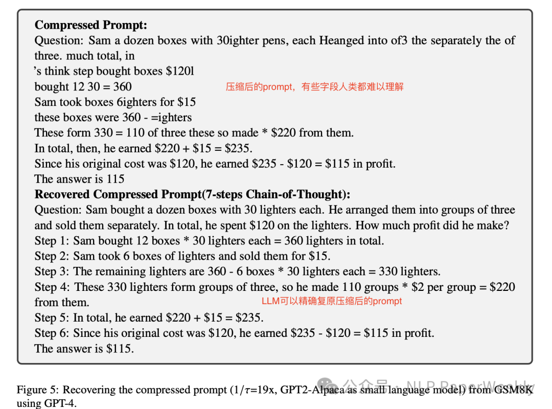 三、总结 总结1:LLMLingua展示了在不损失大型语言模型性能的前提下,大幅度压缩模型输入提示的可能性,这为在资源受限情境下使用复杂模型提供了一条有效途径。 本文利用经过Alignment的well-trained的小的语言模型,例如GPT2-small或者LLaMA-7B,来检测和剔除prompt中的不重要token,将其转化为一种人类很难理解但是LLMs能很好理解的形势。并且这种被压缩的prompt可以直接用在black-box LLMs中,实现最高20倍的压缩,且几乎不影响下游任务性能。[2] 总结2:(Iterative Token-level Prompt Compression)对于保持压缩提示的精确匹配分数至关重要。没有这个组件,精确匹配分数会显著下降。  总结3:LLM的确能懂被压缩后人类难以理解的prompt,甚至还能复原原始prompt出来。  四、参考 [1]: Wei J, Wang X, Schuurmans D, et al. Chain-of-thought prompting elicits reasoning in large language models[J]. Advances in Neural Information Processing Systems, 2022, 35: 24824-24837. [2]: (Long)LLMLingua: 从压缩Prompt出发, 探究属于 LLMs 的语言,缓解Lost in the middle, 提升Long Context 下的性能:https://zhuanlan.zhihu.com/p/660805821 ingFang SC", Cambria, Cochin, Georgia, Times, "Times New Roman", serif;font-weight: bold;color: rgb(0, 0, 0);font-size: 1.3em;letter-spacing: 0.544px;text-wrap: wrap;background-color: rgb(255, 255, 255);border-bottom: 2px solid rgb(239, 112, 96);visibility: visible;">五、更多文章精读- ingFang SC", "Hiragino Sans GB", "Microsoft YaHei UI", "Microsoft YaHei", Arial, sans-serif;letter-spacing: 0.544px;text-wrap: wrap;background-color: rgb(255, 255, 255);text-align: left;">百川智能RAG方案总结:搜索出生的百川智能大模型RAG爬坑之路