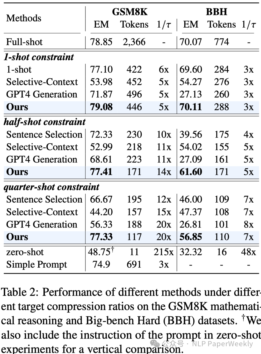 这些结果表明LLMLingua方法在对话和摘要任务中都能够有效压缩提示,同时保持了良好的性能,这对于减少大型语言模型(LLM)的推理成本和提高效率具有重要意义。 3 在数学推理(GSM8K)和复杂语言任务(Big-bench Hard, BBH)数据集上的表现 说明: - 1-shot constraint: 目标压缩比为1倍,即不压缩。