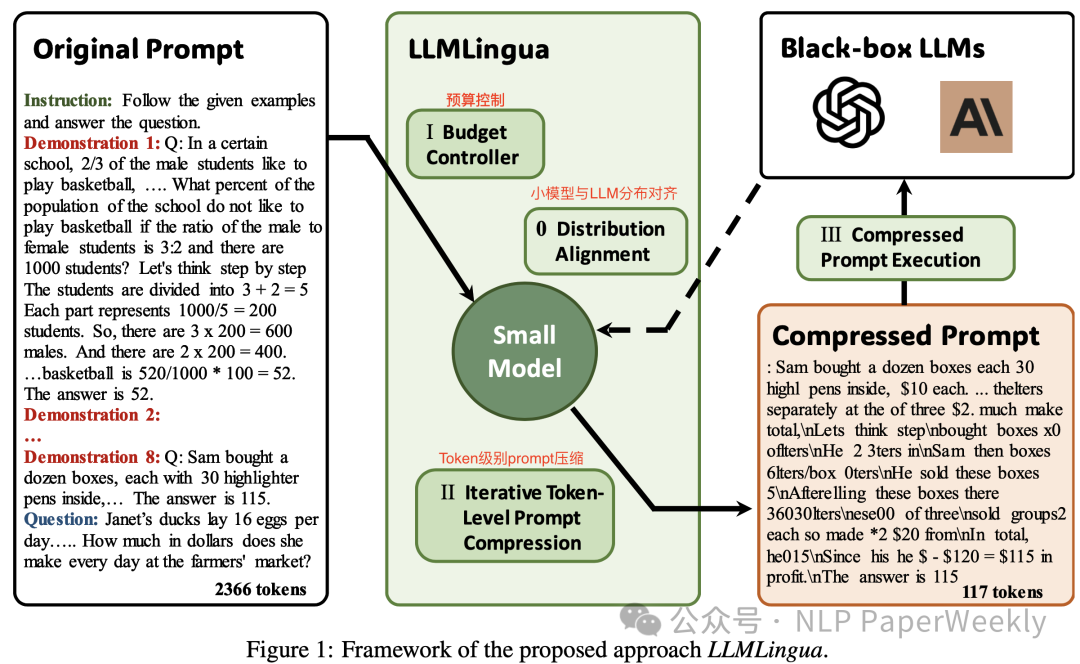- LLMLingua:文章提出的方法,包括预算控制器(Budget Controller)、迭代令牌级提示压缩(Iterative Token-level Prompt Compression)和分布对齐(Distribution Alignment)。