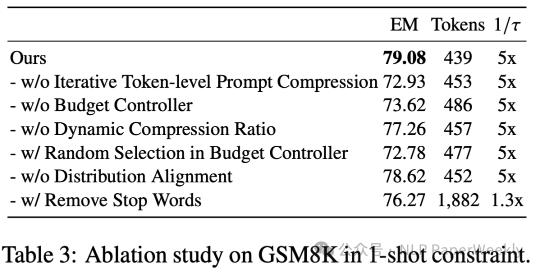 结论: - 迭代令牌级压缩(Iterative Token-level Prompt Compression)对于保持压缩提示的精确匹配分数至关重要。没有这个组件,精确匹配分数会显著下降。