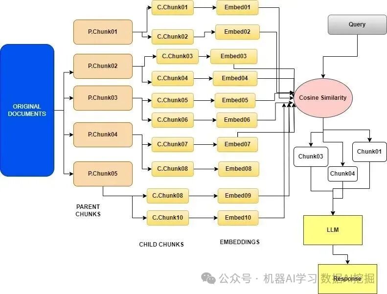从小到大全文档检索 ParentDocumentRetriever通过分割和存储小块数据来达到平衡。在检索期间,它首先获取小块,然后查找这些块的父ID,并将这些较大的文档返回给LLM 它在初始搜索阶段利用小块文本,然后在处理过程中为语言模型提供更大的相关文本块。 递归检索涉及在初始检索阶段获取较小的块以捕获关键语义含义。随后,在过程的后期阶段,将包含更多上下文信息的大块提供给LLM。这种两步检索方法有助于在效率和提供丰富上下文响应之间取得平衡。 步骤: 该过程涉及将原始大文档分解为更小、更易管理的单元,称为子文档,以及称为父文档的大块。它专注于为每个这些子文档创建嵌入,这些嵌入比整个父块嵌入更丰富、更详细。它帮助框架识别包含与用户查询相关信息的最相关子文档。一旦与子文档建立了对应关系,则检索与该子文档关联的整个父文档。在所示的图像中,最终检索到了父块。检索父文档很重要,因为它提供了理解用户查询和做出回应的更广泛上下文。框架现在不仅可以依赖子文档的内容,还可以访问整个父文档。