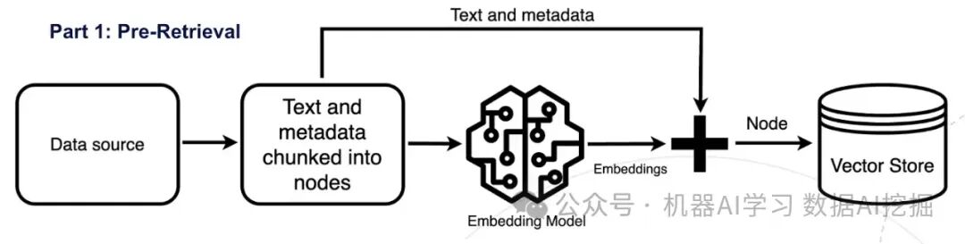 我将讨论来自不同研究论文的各种优化技术。这些技术中的大多数将基于我特别喜欢的一篇研究论文,题为“大型语言模型的检索增强生成:一项调查”。这篇论文涵盖了最近的优化方法。 RAG工作流程分解首先,我们将RAG工作流程分为三个部分,以增强我们对RAG的理解并优化这些部分中的每一个,以提高整体性能: 预检索在预检索步骤中,需要准备LLM原始训练数据集之外的新数据,也称为外部数据。将这些数据分割成块,然后使用嵌入模型对块数据进行索引,该模型将数据转换为数值表示并存储在向量数据库中。这个过程创建了一个LLM可以理解的知识库。