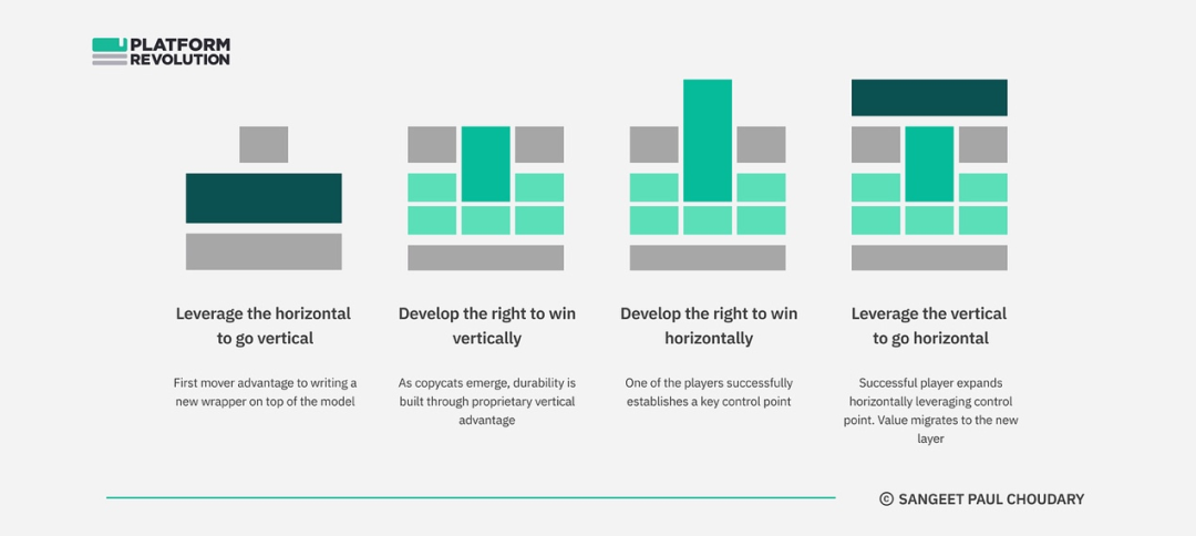 开发某种垂直优势(专有的微调模型、对垂直数据集的访问、特定于垂直行业的用户体验优势或上述所有优势的某种组合),并利用该优势将价值拉入垂直行业。您可以通过创建跨模型和工作流程集成的全栈垂直解决方案来建立优势。