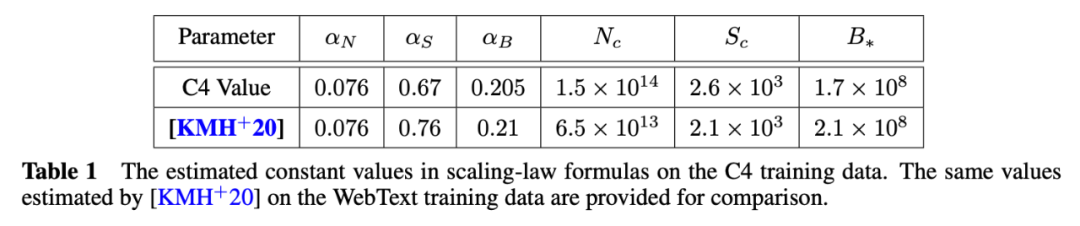 Table 1 展示了在 C4 训练数据上,通过实验估计得到的 scaling laws 公式中的常数值。这些常数包括 αN、αS、αB、Nc、Sc 和 B∗, 表中列出了两组数据: