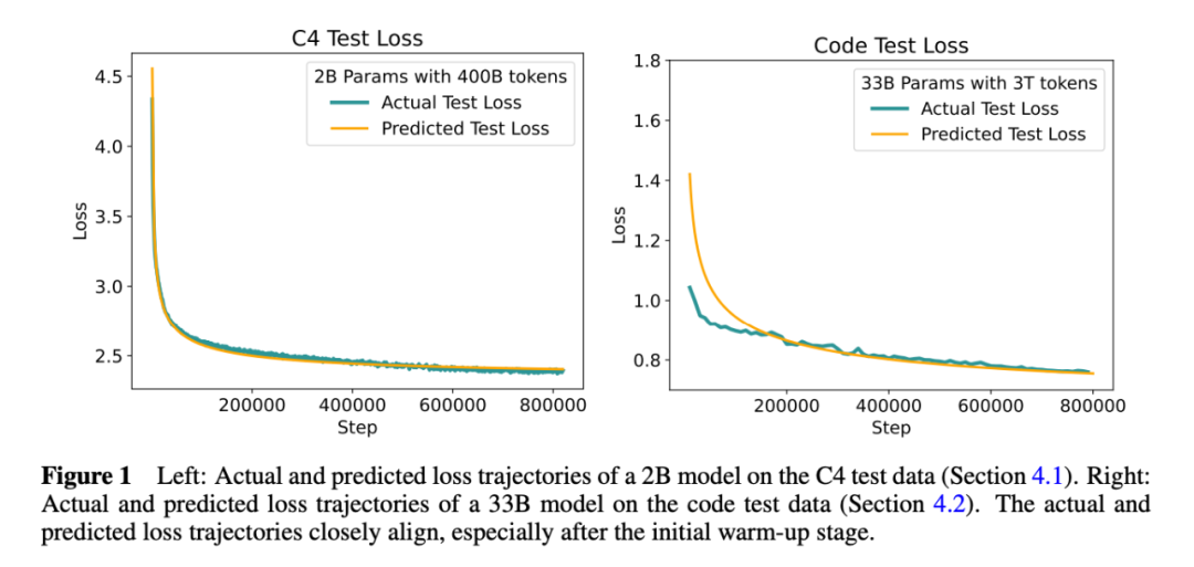 2. 右半部分(Right):33B 参数的模型在代码测试数据(code test data)上的 loss 曲线。同样地,除了在训练初期的 warm-up 阶段外,实际 loss 和预测 loss 在整个训练过程中也保持了很好的一致性。