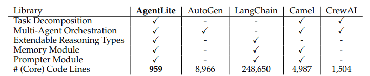 AgentLite 对比其他 Agent 构建库支持的特性 测试结果:AgentLite 可适用于任意 LLM,同时展现了其架构在处理 HotPotQA 复杂任务时具有的强大有效性