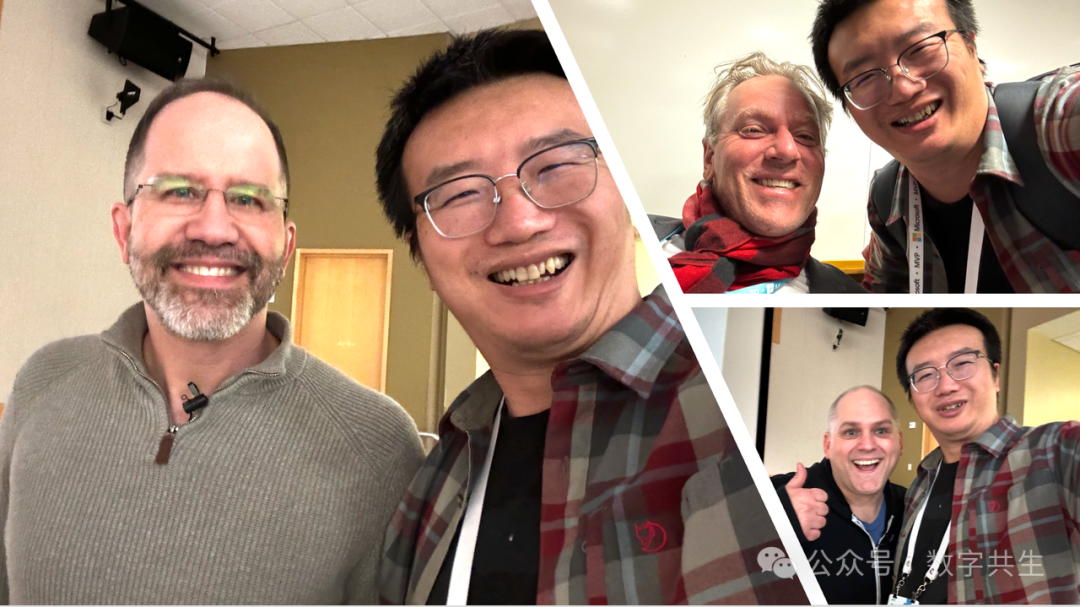 图:微软MVP们在微软总部的合影 (从左至右:Ryan,Tony,张雅琪,李佳芮,刘海峰,苏震巍,苏繁和我)当然,和老朋友们面基也是一件非常快乐的事情。在这里也见到了一些平时只在各种大会keynote和技术分享中才能见到的面孔。 图:Scott Hanselman, Adam Cogan(微软MVP/RD) 和 Martin Woodward(GitHub开发者关系副总裁)此行还有一个非常重要的任务,就是为本文开头部分的问题寻找答案。