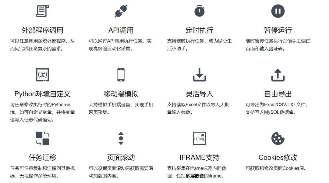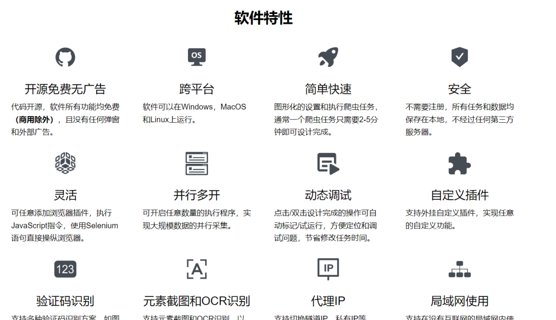 这是一款无代码可视化爬虫软件,专为无编码人员设计,用于从互联网上爬取数据。它提供了强大的爬虫功能和丰富的数据处理与导出选项,能够迅速抓取各类网站上的结构化数据,如商品信息、论坛帖子等,并可将数据导出为Excel、CSV等格式。地址我放文末了,先来看看软件的特性: