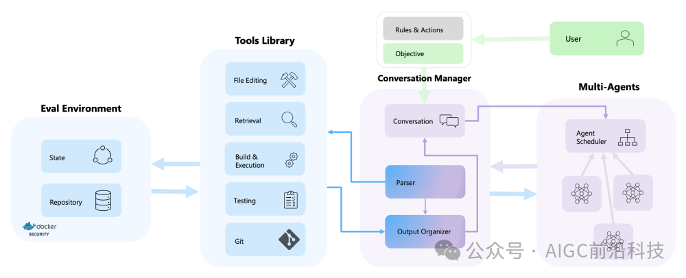多智能体协作:AutoDev的架构支持多个智能体协同工作,每个智能体都有特定的角色和责任,共同完成复杂的软件工程任务。