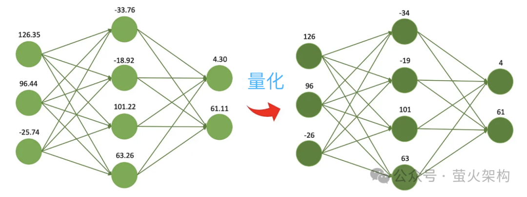 量化就是降低模型参数的数值精度,比如最开始训练出的权重是32位的浮点数,但是实际使用发现用16位来表示也几乎没有什么损失,但是模型文件大小降低一般,显存使用降低一半,处理器和内存之间的通信带宽要求也降低了,这意味着更低的成本、更高的收益。