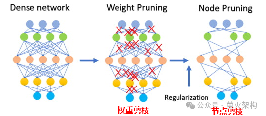 剪枝不仅涉及权重参数的剪枝,还可以剪除某些神经元节点,如下图所示: