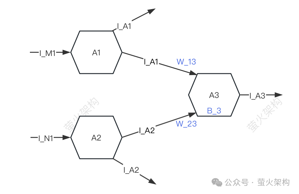 其中A3会接收A1、A2传递过来的信号I_A1、I_A2,但是A3接收A1、A2信号的强度是不一样的(这个强度称为“权重”),假设这里的强度分别是W_13和W_23,A3会对接收到信号数据进行加工: