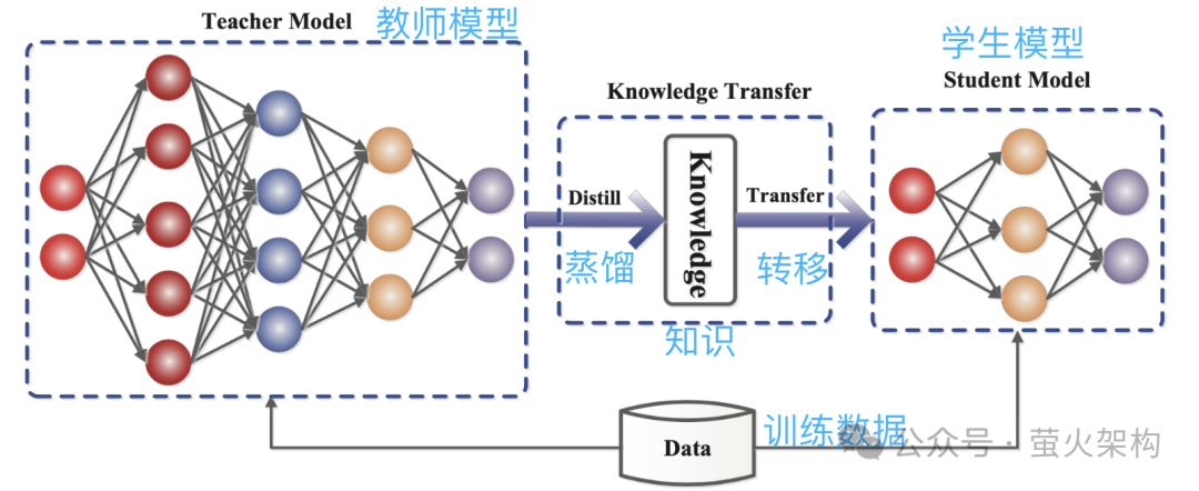 蒸馏就是把大模型学习到的概率分布直接复制到一个小模型中。被复制的模型称为教师模型,一般是参数量较大、性能很强的优秀模型,新模型称为学生模型,一般是参数比较少的小模型。