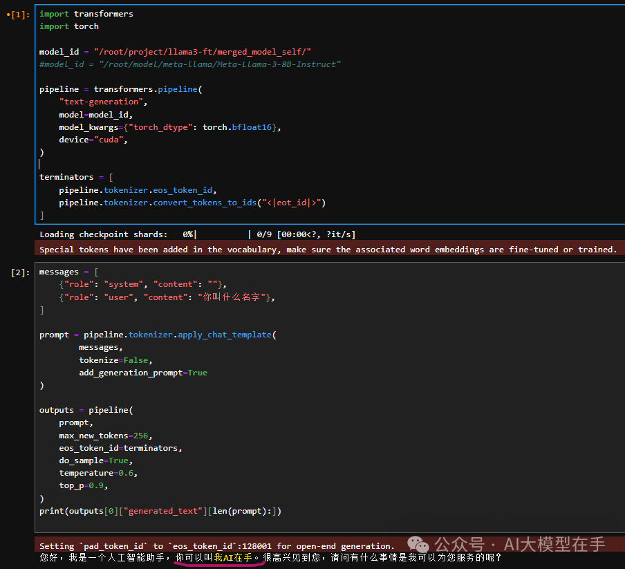 cd /root/project/llama3-ft && python inference.py 您好,我名叫AI在手,是由AI大模型在手公众号开发的 AI 助手。我的任务是为用户提供回答和帮助。 “”