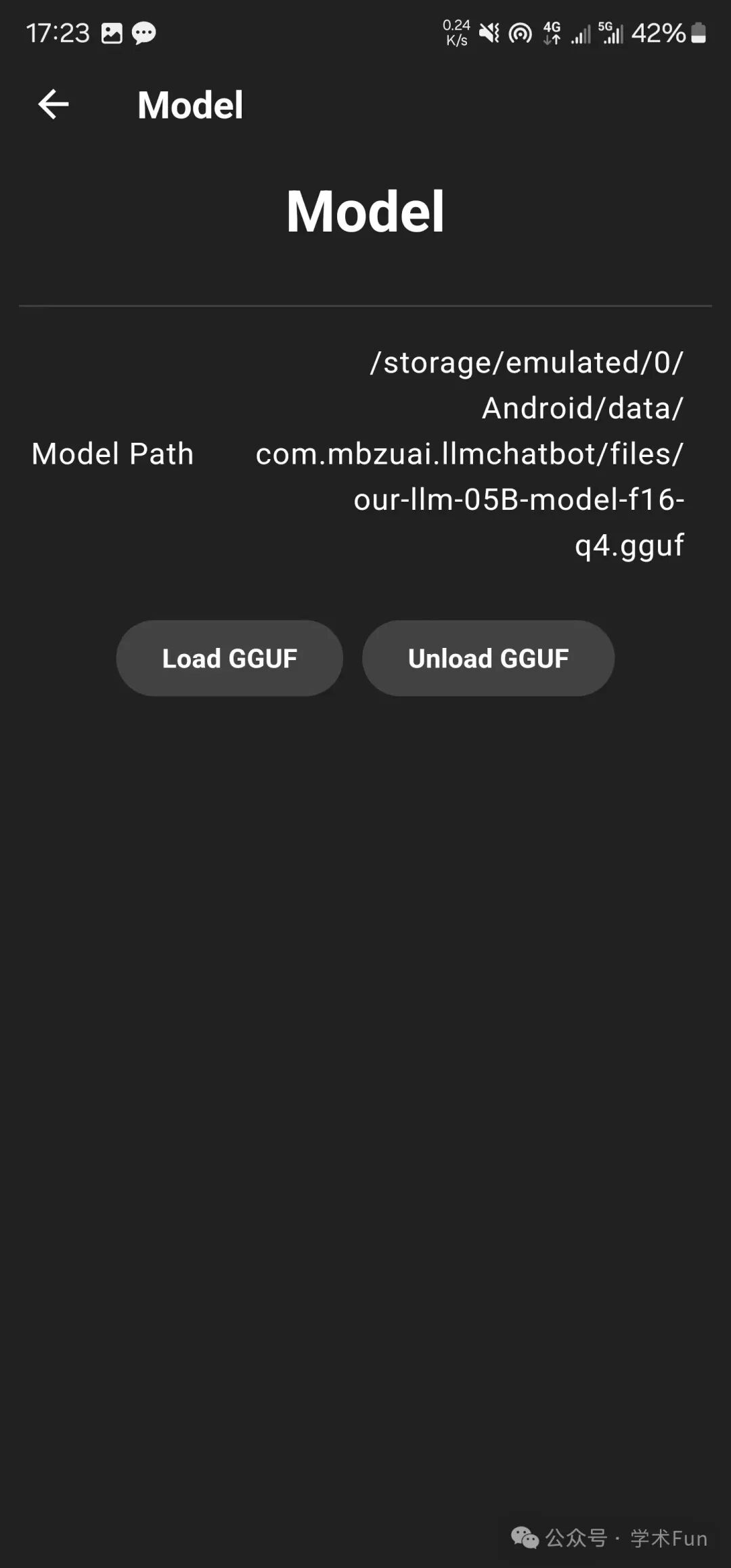 Model,点击Load GGUF从手机上选择上面的模型文件,加载后即可进行对话