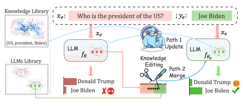 大模型知识编辑旨在通过内部更新或外部干预的方式缓解大模型知识谬误问题。如下图所示,通过符号知识或参数知识引导,大模型可以基于知识编辑技术通过更新或融合的方式实现对固有知识的编辑操作,实现从 (US, President, Donald Trump)到 (US, President, Joe Biden)的知识更新。