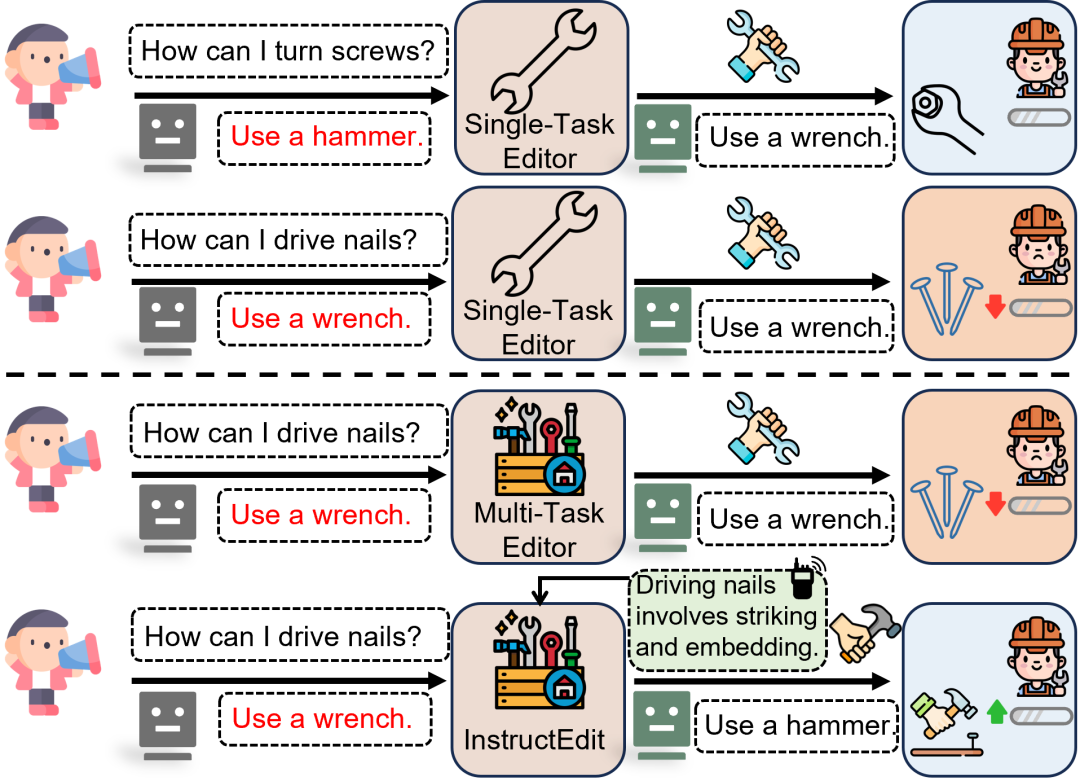 例如,如下图表所示,当使用“我该如何拧螺丝?”作为提示时,知识编辑可以专注于大模型中的特定区域进行调整,将答案从“使用锤子”更改为“使用扳手”,同时不损害模型的整体性能;但在遇到“我该如何钉钉子”的不同任务提示时较难泛化。从本质上讲,现有知识编辑方法仅保存当前编辑知识,其更新功能仅限于所提供的数据,限制了模型在其他领域的泛化能力。