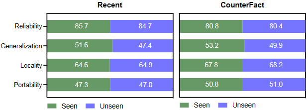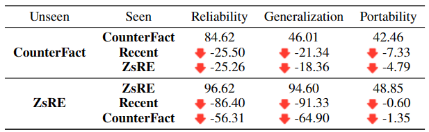 在训练时,我们保留了ConvSent的原始设定。此外,我们还设定了一个Hold out设定。从经验上看,我们发现将其他任务的编辑知识迁移到ZsRE是具有挑战性的。因此,我们使用零样本关系抽取数据集(ZsRE)来评估多任务编辑在任务层面的泛化能力,这意味着我们并未在多任务编辑训练集中包含ZsRE。同时,我们在ZsRE的原始数据集中添加了迁移性和新的局部性测试集合,以增强我们使用的版本。在评估指标方面,我们是沿用KnowEdit[1]的设定。