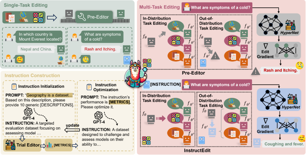 我们的主要目标是让编辑器具有理解和应用编辑指令的能力,从而提高其编辑常规分布之外的任务的能力。此外,我们在输入之前添加指令,以便进行多任务编辑。InstructEdit旨在增强多任务编辑能力,寻求一种协同效应,使多任务结合的作用超过单任务的贡献。通过指令连接,InstructEdit旨在将任务向量聚类并减少任务间的冲突,从而确保多任务编辑器在单个任务上的性能达到,甚至超过单任务编辑器的性能。