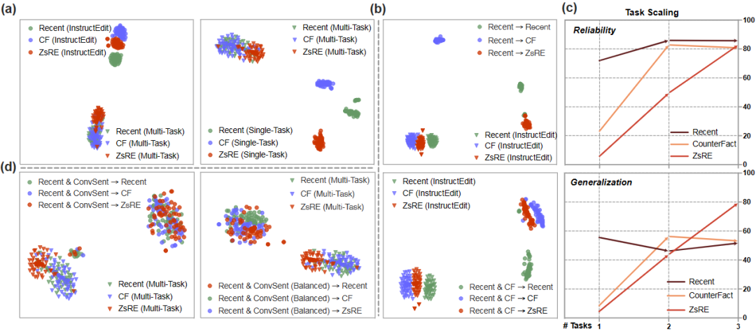 适当的数据比例可提升性能。初步实验发现如下图 (d)所示,任务不平衡影响了多任务训练,导致性能显著下降。通过平衡不同任务的数据比例,我们发现知识编辑梯度方向变得更加规则,编辑可靠性得到提高。这证实了适当的数据比例在多任务编辑中的重要性。