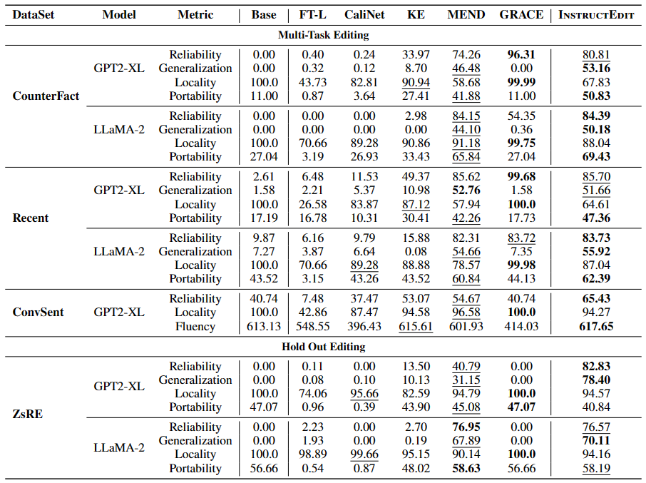 多任务编辑结果:下表表中展示了相应结果。FT-L和CaliNet保持了原始模型的完整性,因此拥有高局部性,但它们在其他指标上的表现却明显不足。修改模型参数的编辑方法,如KE和MEND,在性能上超过了以前的编辑方法。MEND和KE在所有指标上表现优异,实现了可靠性和局部性之间的平衡。这归因于它们的优化目标限制了更新范围,使编辑器能够在保持模型稳定性的同时调整参数。我们可以观察到,InstructEdit通过指令引导方法提高了编辑精度和控制能力,在分布内的数据集上达到了超过MEND和KE等方法的效果。