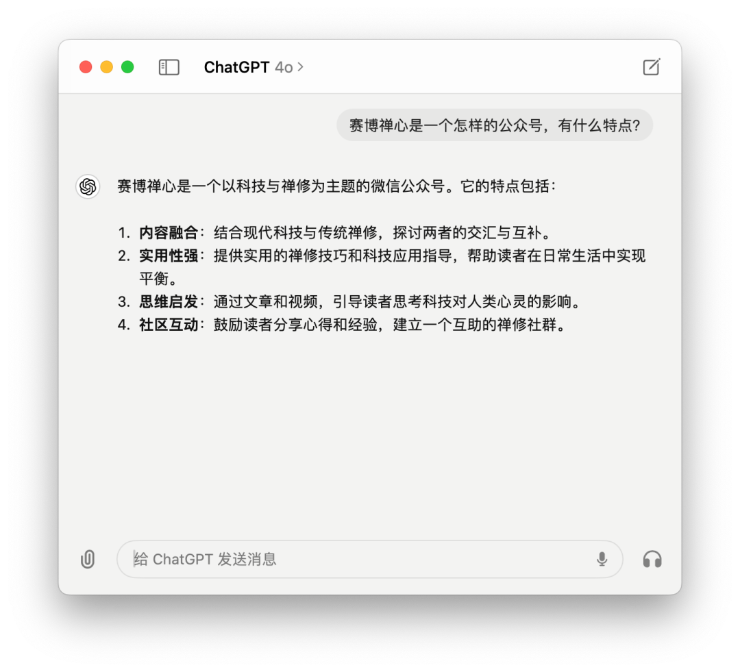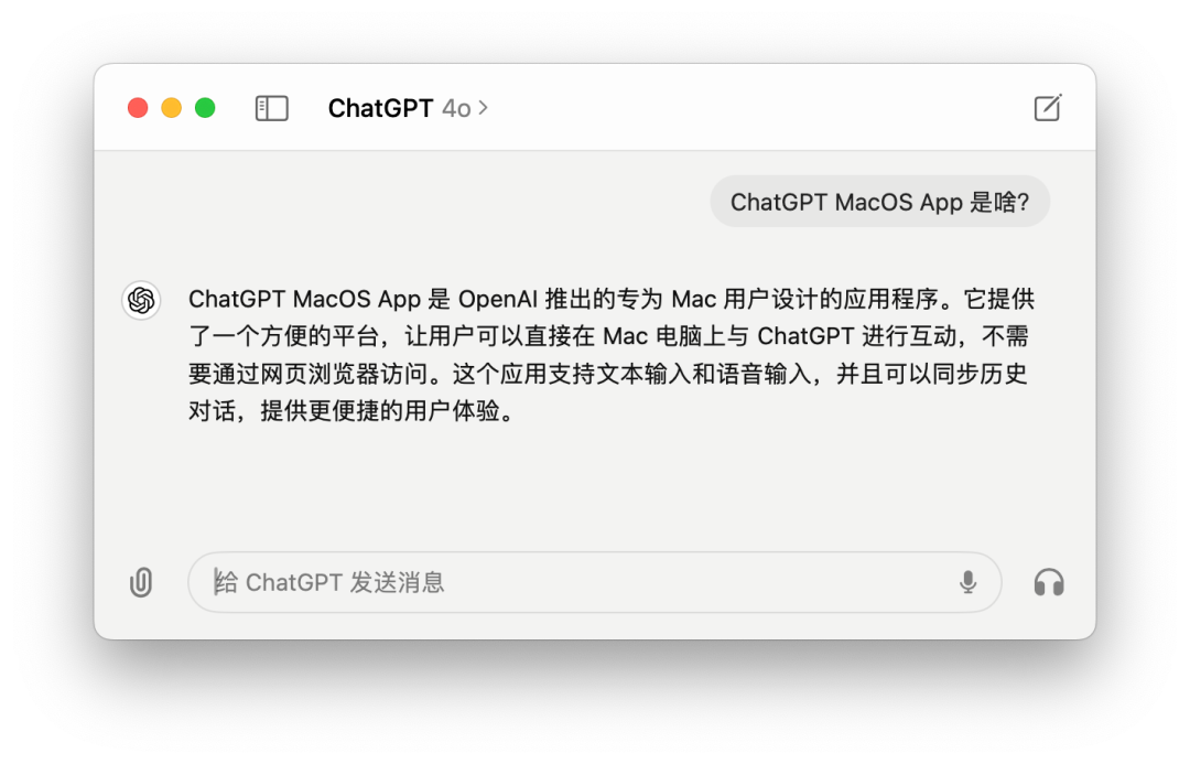 永远可以相信 赛博禅心总有第一手消息 接下来是相关测试 在前两天的发布会里,OpenAI 带来了一系列的更新:OpenAI 发布会:超大杯 GPT-4o,颠覆很多行业,其中就包括ChatGPT MacOS App。本着原汤化原食的原则,我要让这个软件自己来介绍一下: