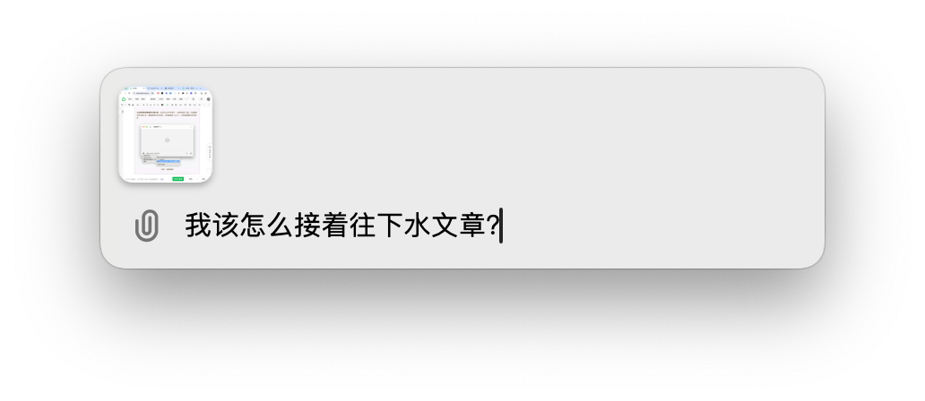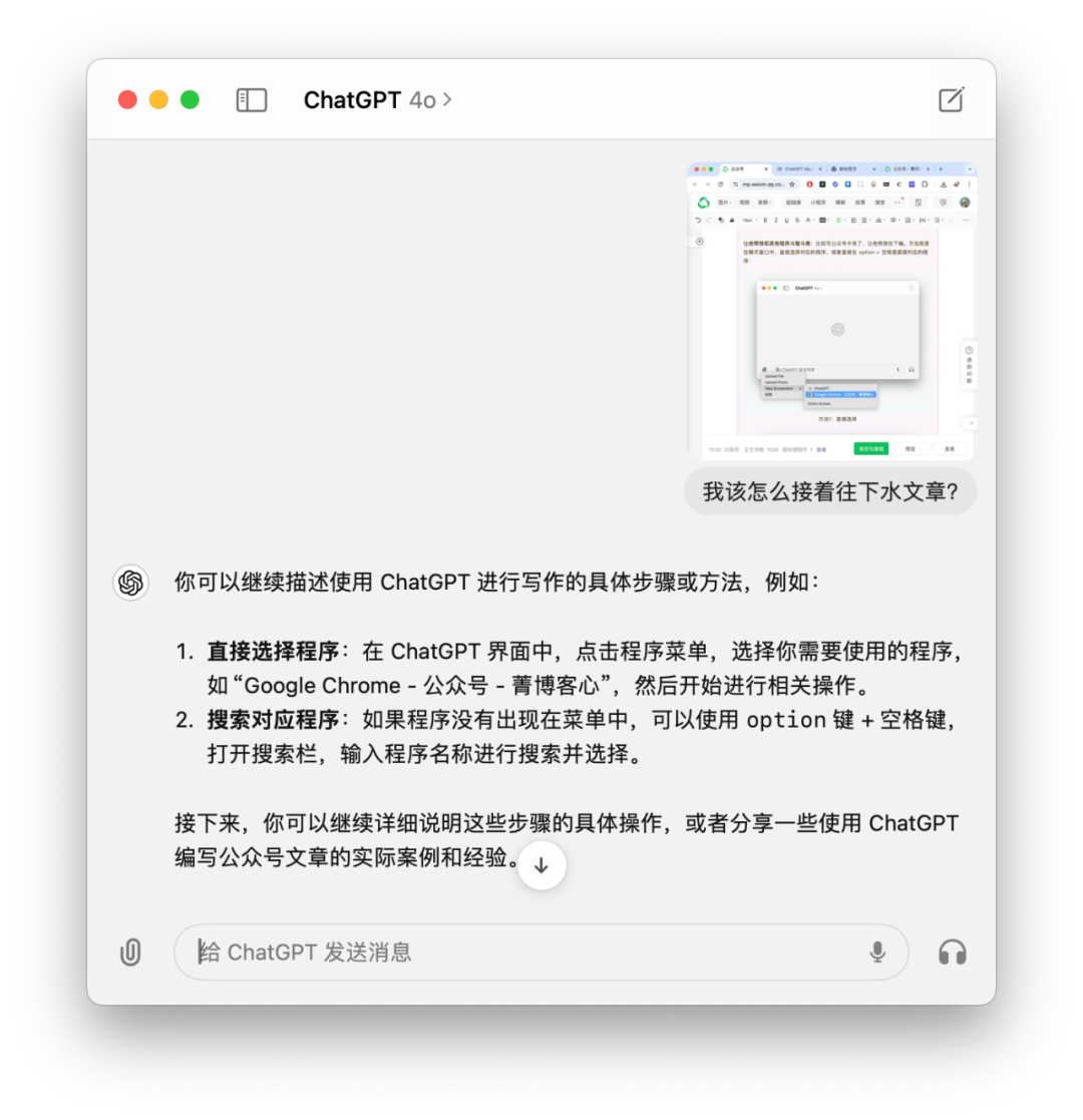 截图来聊:比如写公众号卡壳了,让他帮我往下编。方法就是在聊天窗口中,直接选择对应的程序,或者直接在 option + 空格里面搜对应的程序: