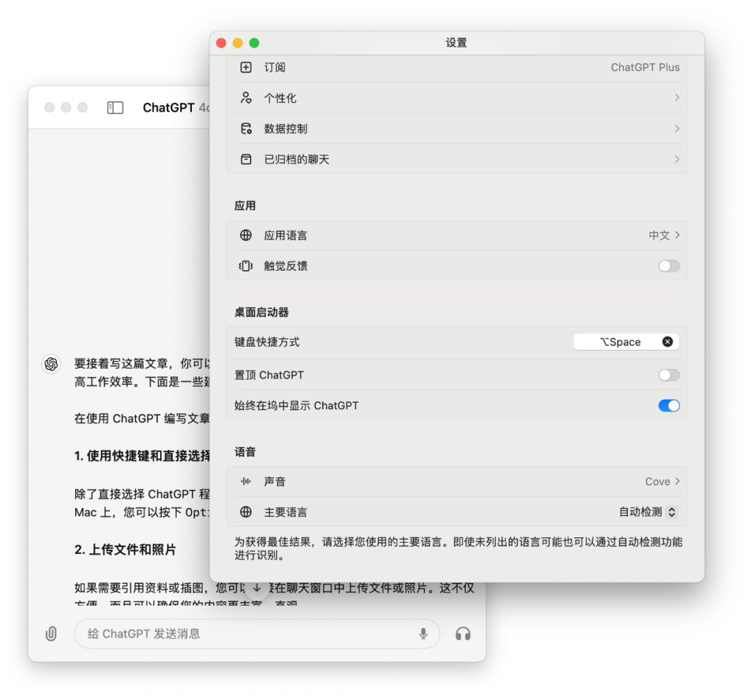 个人觉得,这个应用能显著降低自己打开 OpenAI 的网站的频率。毕竟能随时随地使用,总是最好的。 但作为还没完全开放的产品,bug 什么的总还是有的,比如在开启音频对话的时候,60% 会网络出错。但相信,全量上架后,这些毛病都会修复。 以及啊,这个产品也像网页版 ChatGPT 一样,支持你进行各种设置,比如快捷键、数据权限等,可以根据自己的偏好来。