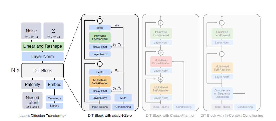 上面这张图展示了扩散Transformer(Diffusion Transformer,DiT)模型的架构。图中分为三部分,分别描述了模型的整体架构和两种不同的DiT块的设计:带有自适应层归一化的DiT块和带有交叉注意力的DiT块。