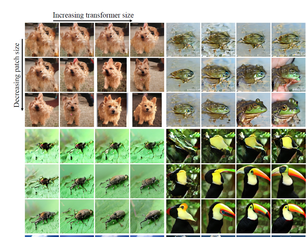 下面这张图展示了不同Transformer模型规模和patch(图像块)大小对生成图像质量的影响。图中以生成的狗的图像为例,从不同的Transformer规模和patch大小的组合中展示了生成结果。