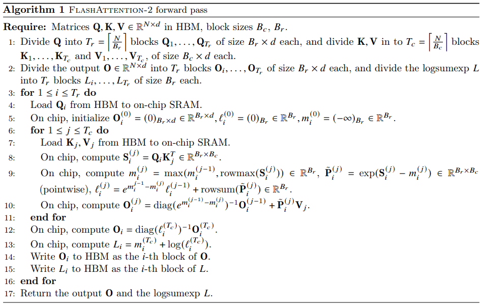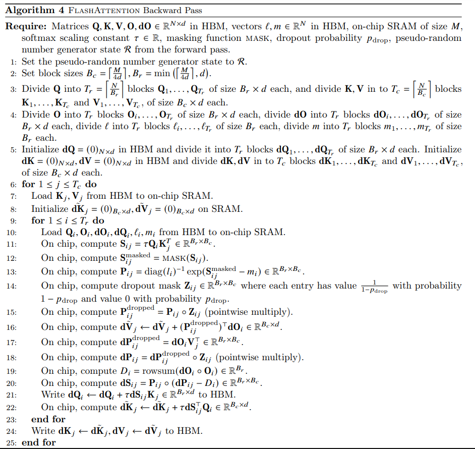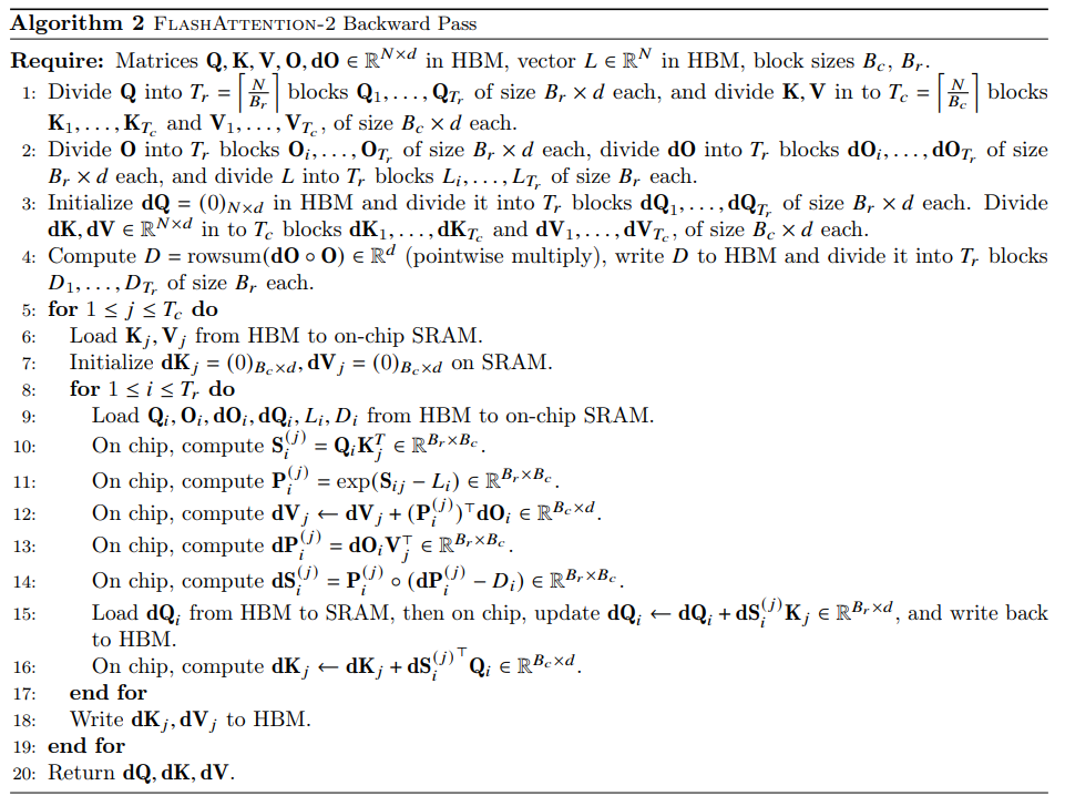 对于反向传播阶段,flash-attention2 避免直接存储以及的指数和,作者使用来代替原本反向传播的13行。最终flash-attention2的前向传播和后向传播的伪代码如下: