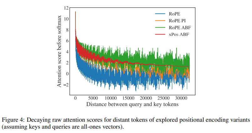 可以看到位置编码,只和旋转角度m-n的相对位置相关,但实验中发现距离越长衰减越厉害,导致attention score 分数过低,于是【7】插值方法来抵消掉m-n扩大带来影响,ABF方法也是类似,都在补偿m-n的过大带来衰减。