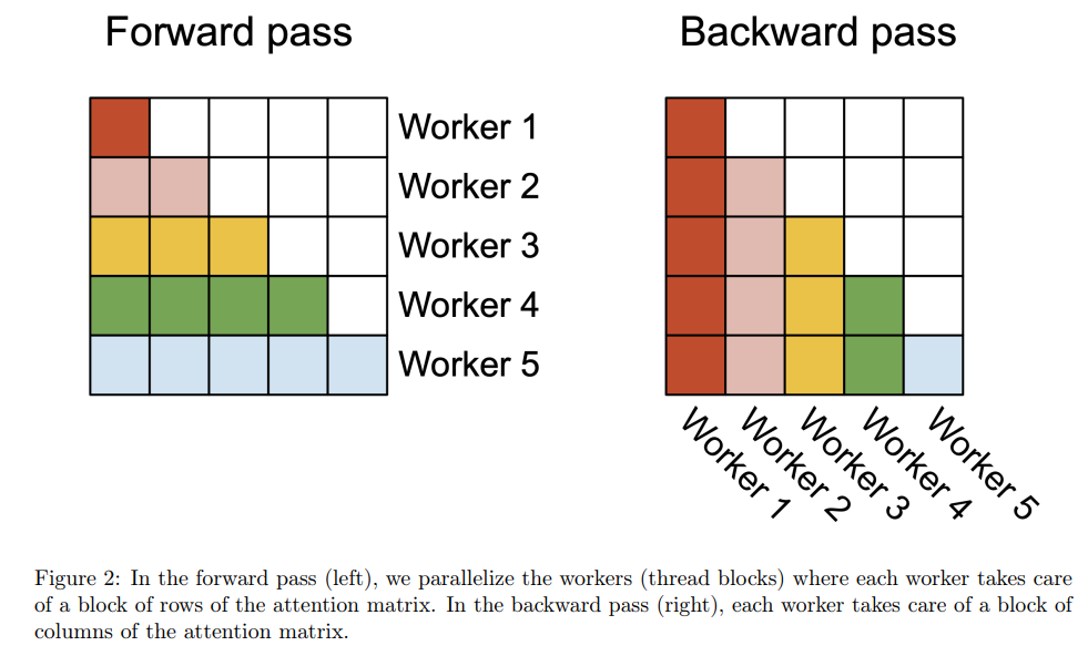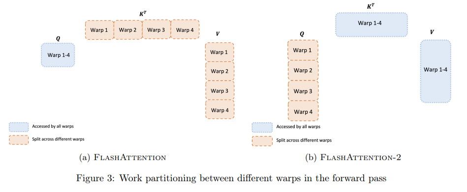 FlashAttention-2 forward pass. FlashAttention-2将移到了外循环,KV移到了内循环,并将Q分为4个warp,所有warp都可以访问K和V。这样做的好处是,原来FlashAttention每次内循环会导致的不断变化(需要通过HBM读写),现在每次内循环处理都是同一个,此时可以存储在SRAM上的,代价远小于读取HBM。