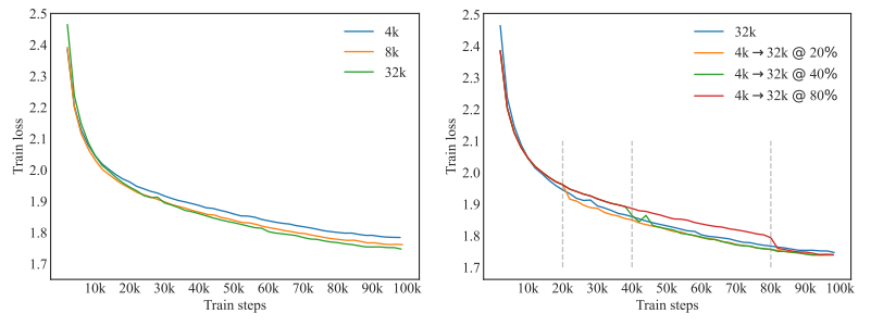 大模型长文本能力来自于预训练,那么预训练阶段不同文本长度的loss情况直接决定模型对长文本的支持能力,因此需要测算模型在不同文本长度下loss收敛的情况,以及如果单纯改变训练文本长度,大约需要多少step模型可以收敛至稳态。