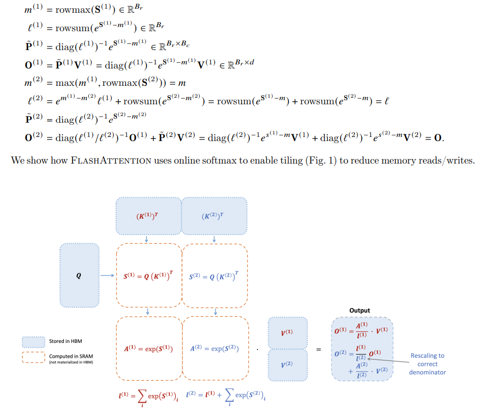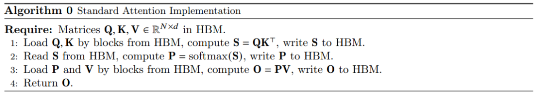 其中N为序列长度,d为embedding维度,考虑到N远大于d,因此最终结果约等于 ,而一般经过multi-head之后的embedding维度大约在64左右,因此整个计算是 内存受限。因此如果能够把数据放置在SARM上并减少对于显存的访问次数,不仅能够降低显存占用还可以加快attention的计算。但缓存的大小有限,我们假设一块SARM能够存储1000个数据,向量Q、K维度均为100*10。而2*100*10的数据点是无法存放在SRAM上,因此必然需要从显存中读写数据。但是如果能够对矩阵进行分块,把 100 * 10的矩阵拆分成2个 50 * 10 的小矩阵,这样就能直接从SRAM读取。标准的attention计算方式如下: