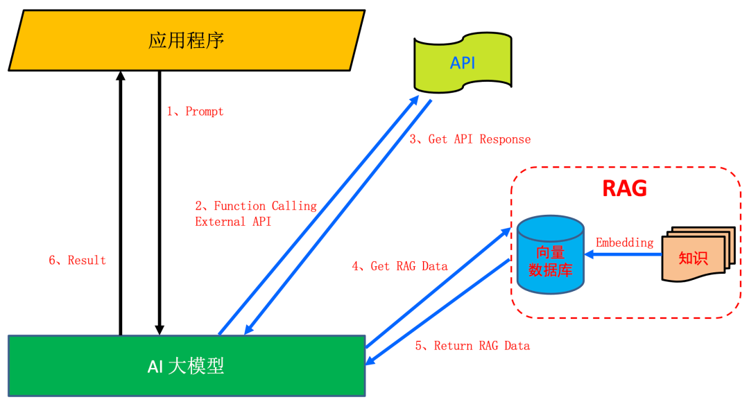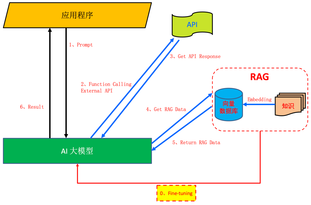 以上是表面上的区别,底层逻辑或者说底层技术架构又有哪些不一样呢?我们先看看直接调用公有通用大模型的技术架构:这种是最简单的方式,行业应用通过提示(Prompt)给到AI大模型直接拿到结果。当然,如果只调用一个通用大模型(而不是多个),也就变成了常说的“套壳”,调用多个可以说是“集成”,哈哈。此外,大模型本身通常无法获取实时信息(比如实时股票信息),调用外部实时数据,通常可以通过函数调用(Function Calling)的方式,如下图所示:回到今天的主题:行业大模型,它可以基于通用大模型,有几种架构可以实现对行业特定知识的获取。