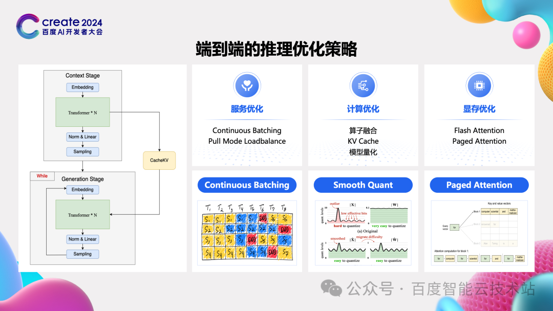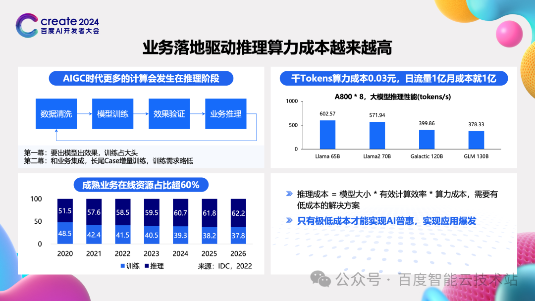 在一个 AI 业务的发展中,出现的第一幕肯定是训练,这涉及到数据清洗、模型设计、模型训练,然后配合一些效果评测,这是大家关注的焦点。 但是更重要的是第二幕。只有将模型转换成业务,落地成应用,这个模型才有价值,同时在部署落地后又搜集到更多的反馈,特别是长尾 case 和需求,然后再做迭代训练。在这个过程中的训练频度或者力度会显著下降,在这个阶段更多考虑的就是推理对基础设施的需求了。 左下角我引用了 IDC 2022 年的一个报告,说明随着业务成熟的落地,推理会占据 60% 以上的算力。当达到这个阶段 AIGC 时代就会真正到来了。 推理是需求的主体后核心问题是什么呢?和训练相比,在单一任务的规模和稳定性上的要求都会小些,推理的核心问题就是成本了。 在下图右上角,我们用早期的推理性能数据做了一个非常粗略的核算。按照 8 卡来推理一个 65B 以上的模型性能来看,每个 token 的成本可能高达 0.03 元。而一个成熟的业务每日上亿的流量是非常容易的,这样每天的成本都高达一个亿。随着模型规模的扩大,流量的上涨,这个成本只会更高。其中,推理的成本和模型大小,算力的有效利用效率,还有算力本身的成本都成正比。 所以我们需要从这三个维度想办法,降低用户调用大模型的成本。只有这样才能实现 AI 普惠,才会驱动 AIGC 应用的爆发。