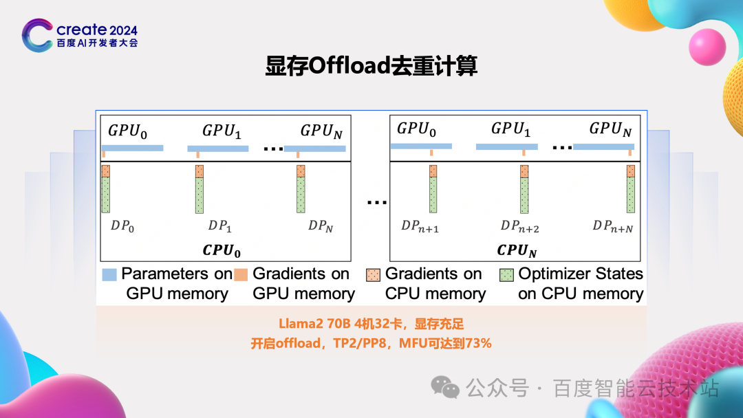 除了 Hybrid Recompute 策略,我们还针对 zero 的一个延伸能力 zero-offload 做了深入研究并在百度百舸的 AIAK-LLM 中做了实现。 zero-offload 核心的原理,和我们前面介绍的 zero1/2/3 这些策略不一样,他将优化器、参数或者梯度给 offload 到 CPU 的内存中,当需要的时候则发起 Host To Device 的操作,将相应数据拉到 HBM 中进行计算。 我们测试了 Host To Device 的带宽后发现,如果只是 offload 优化器,带来的时间开销是比重计算要小很多的,所以我们做了一个优化,通过 zero offload 去掉了很多场景的重计算。 这还没完,我们进一步思考,在显存充足的情况下,我们通过 zero-offload 节省了显存,那这些显存是否可以给 TP/PP 这些切分策略或者 MBS 这些参数提供空间,比如更小的 TP 或者更大的 MBS。经过实测,部分场景还真符合咱们这个预估。 比如 Llama2 70B 4 机 32 卡这个场景,显存充足,本来最优 TP 策略是 TP4,但是开启 offload 后,TP2/PP8 可以获得一个更好的性能,MFU 可达到 73%。