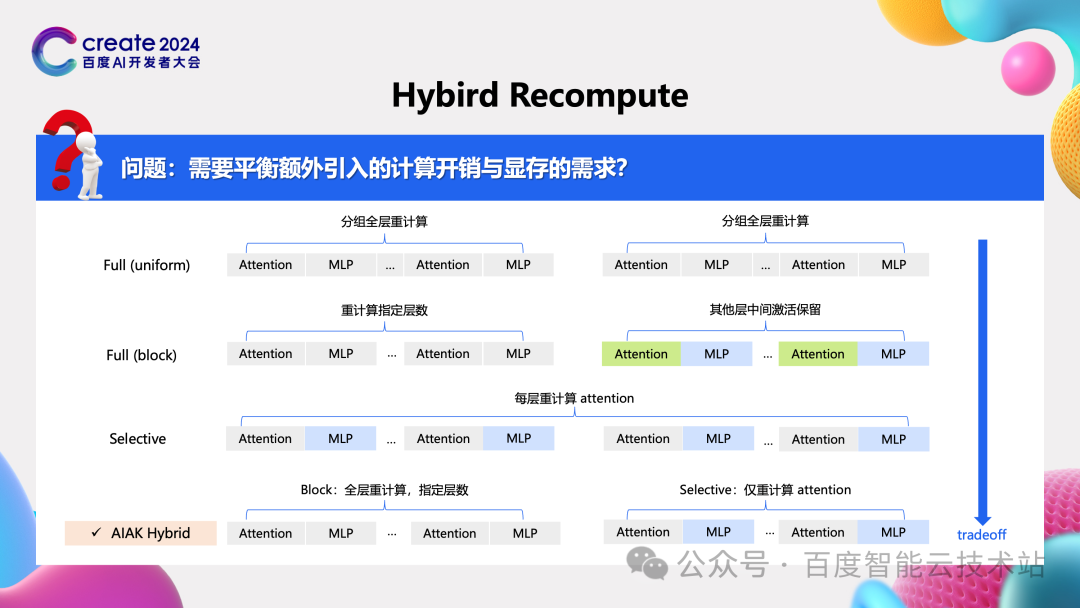 第二个问题针对重计算的问题。 在一些小规模的情况下,即使做了 zero 相关的优化,显存还是不够,这个时候就会去做重计算,丢弃前向计算过程中的激活值节省显存,在反向计算过程中需要相应的激活值则重新计算一遍。 现有的重计算有 full(uniform)、full(block)、selective 三种,我们在调优某个国内模型的时候发现这三种策略还是不能很好的平衡计算的浪费和显存的节省。因此我们构建了一个融合的模式,通过参数可以指定部分层采用 full(block)策略,部分层采用 selective 策略,再通过测试可以找到一个更好的平衡点,从而获得性能上的提升。
