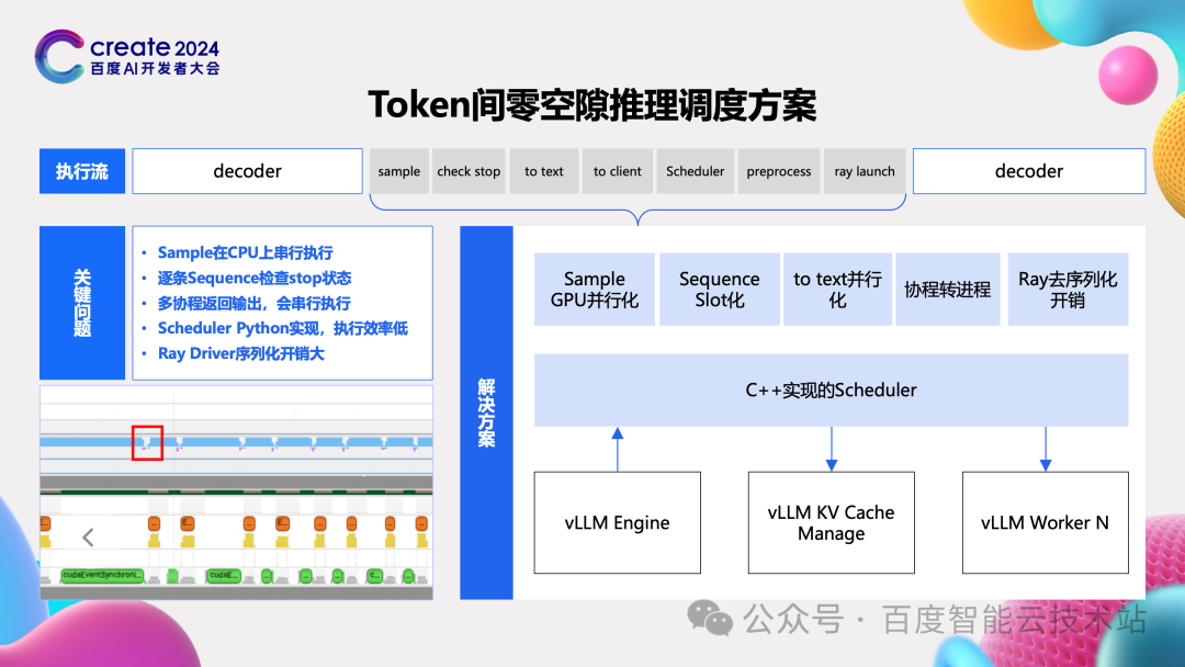 首先说 token 间。我们从一个执行流来看,推理做完前向计算后,在计算下一个 token 前还有非常非常多的步骤需要做。这包括 sample、check stop 这些扫尾操作,也包括 to text,to client 这些返回内容的操作,还包括 scheduler 等下一个 token 相关的操作。这么多操作步骤在当前的一些方案中都是串行执行的,自然就引入了大量的 token 间等待时间或者说是 token 间空隙。 我们解决这个问题的核心思路有三点: 第一点把一些操作放到 GPU 上来执行,比如 sample 计算。 第二点就是极致的并行化。这包括 to text 与后面一些阶段的并行,同时 to client 我们采用多进程的模型实现并行化。 第三点则是用 C++ 重构 scheduler 的模式。现在像 check stop 这种操作都是和 sequence 数目正相关的,因此我们重新设计了 slot 的逻辑,让这种操作都可以并行的去执行,进而消除或减少了相应的等待时间。