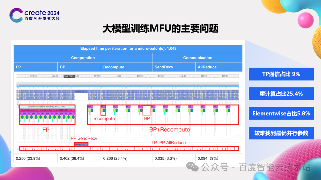 3 百度百舸 AIAK 核心优化 3.1训练优化 所以接下来,我们从一些实际 case 出发给大家分享下 AIAK-LLM 中的一些核心技术。 首先看训练。前面也介绍了开源方案在一些好的情况下能达到的 MFU,这两者之间有比较大的差距。 图中展示了一个典型 case,左边是训练过程中的 trace 图。从这个图中我们可以看出,还是有非常多的时间不是在进行密集的计算,因此我们将每个阶段的影响进行的细化,主要看到这四个方面的问题。 第一个方面的问题是 TP 占据的时间较长,占到了近 10%,和我们前面预估中用到的 2% 甚至零开销差距较大。 第二个方面的问题也是我们前面介绍显存优化的时候提到的,由于显存不足开启了重计算,占据了多达25% 的时间, 第三个方面的问题则是一个常见问题,elementwise 算子的开销。这个问题最直接,一般都会想到去做算子融合。前两个问题就需要做专门的研究,产出一些相关的策略。 第四个方面的问题则是如何为训练任务找到最优的并行参数。